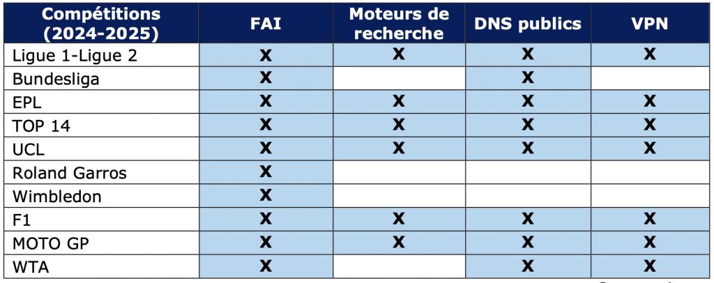 The following table identifies the blocking approaches requested by various sports organizations. “FAI” = “ISP.” “Moteurs de recherche” = “Search engines.”