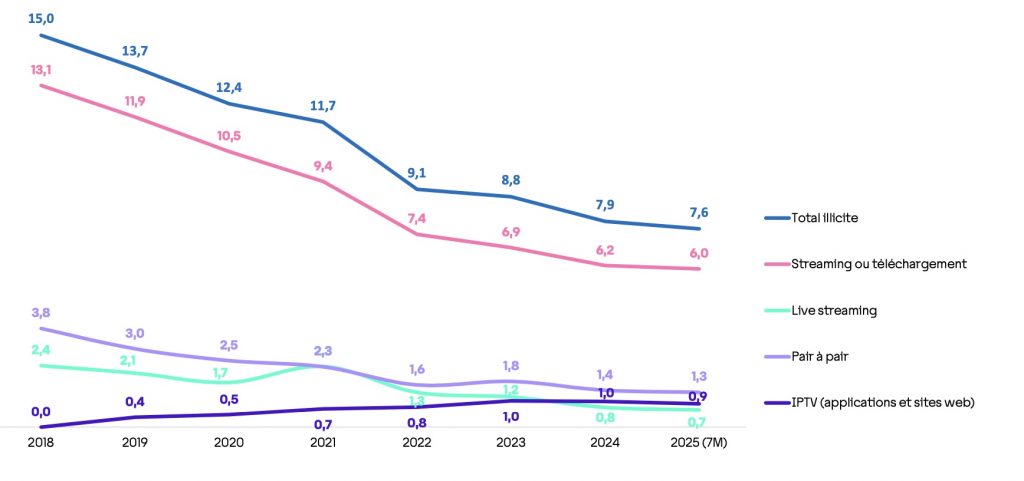While peer-to-peer downloading has declined, pirates have moved to streaming via mirror sites and change domain names to evade blocking. ARCOM says that the use of illegal IPTV services has grown to 11% of French Internet users. Two thirds of these users say they started three years ago or less.