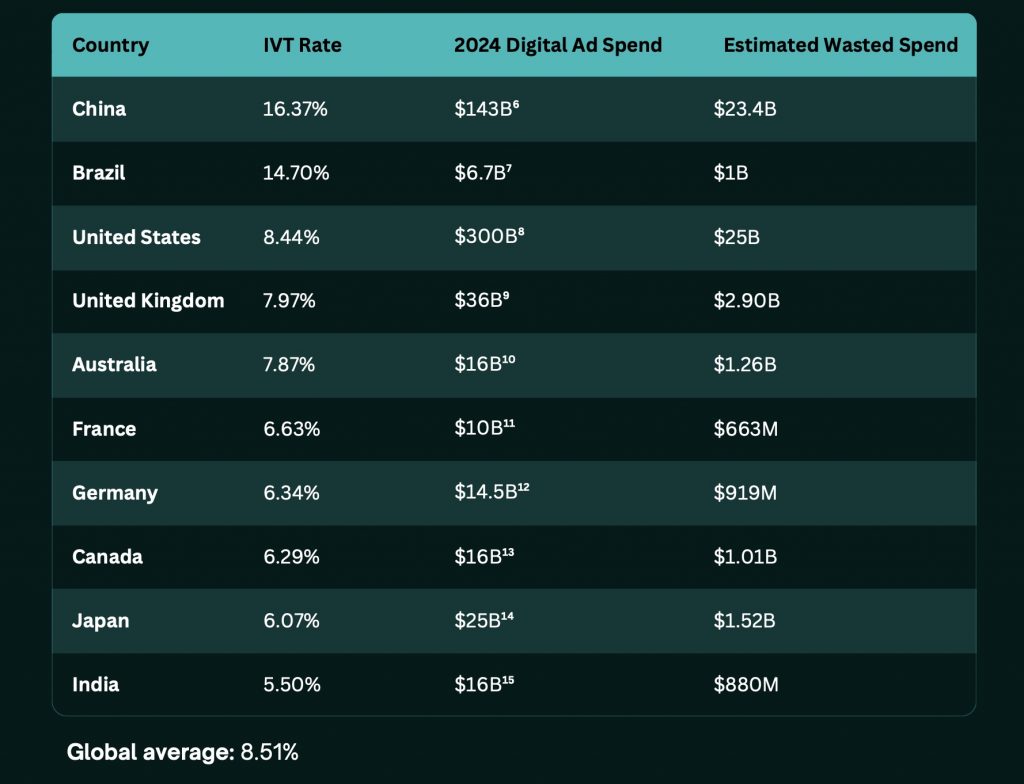 With US digital ad spend estimated to have exceeded $300B in 2024, an 8.44% IVT rate means more than $25B was spent driving traffic with no real conversion potential. In the UK, where annual digital ad spend surpassed $36B, the equivalent wasted advertising expenditure was estimated at $2.9B.