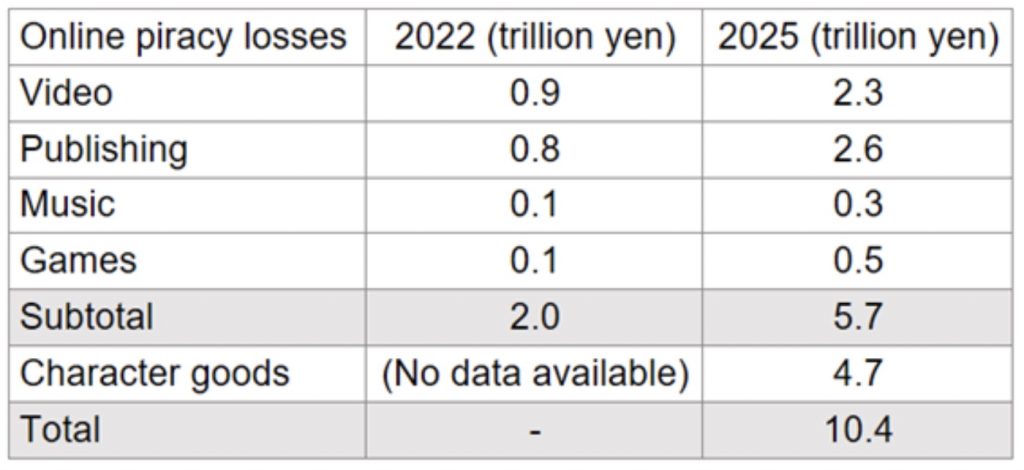 Losses stemming from online piracy in 2025 were estimated at 5.7 trillion yen for digital content alone, and to ¥10.4 trillion including the losses from counterfeit character goods sold online, which were surveyed for the first time this fiscal year.