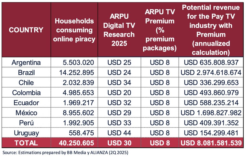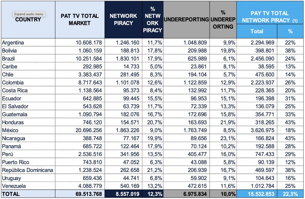 About 22.3% of the more than 69.5 million in that region access pay TV programming through illegal means, according to a report conducted by BB Media and released by ALIANZA (the Anti-Piracy Audiovisual Alliance) in November 2025.