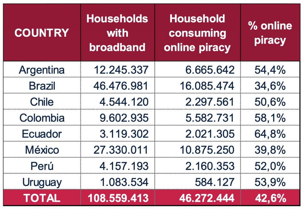 Online households were a different story. Across the same countries, about 46 million consumers (42.6%) out of about 109 million households consume online piracy; about double the rate for pay TV. Online piracy households were segmented into those without pay TV services, and those with pay TV.
