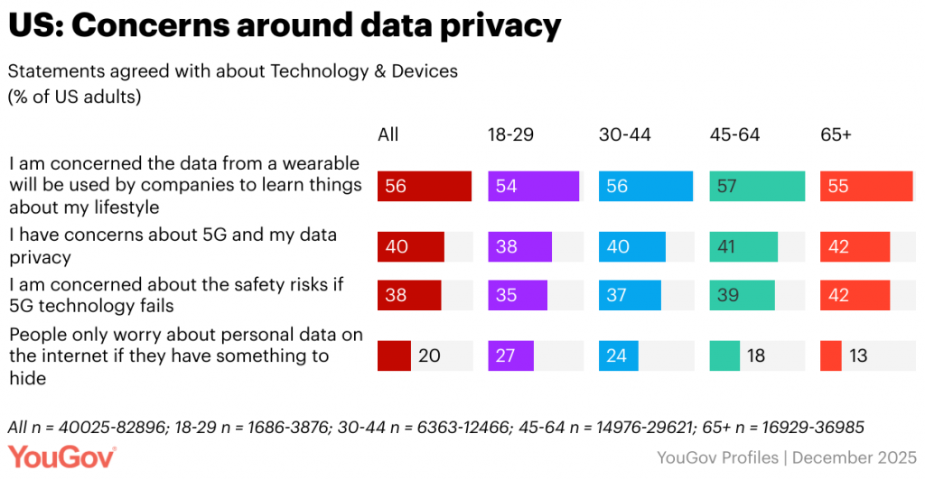 - 56% are concerned that wearable devices could reveal personal lifestyle details to companies, making wearables a top data privacy concern.