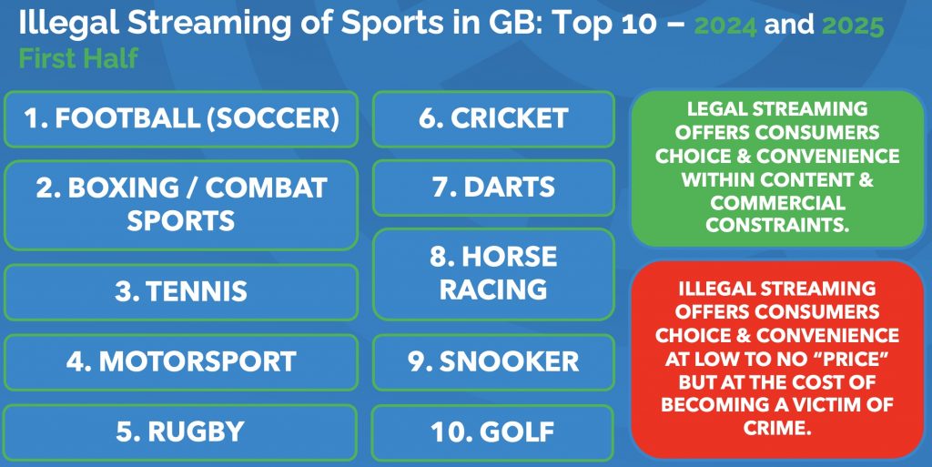Research of the British streaming industry by the US-based Campaign for Fairer Gambling found that during the first half of 2025, 3.1 billion illegal stream views of 90 seconds or greater occurred across the Top 10 British sports from audiences in Great Britain. There were 1.6 billion such illegal stream views in 2024.